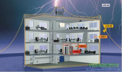 在國際標準IEC 61312-1中描述的分區防雷的觀念已被證實是合理的、有效的。這個理論的基本思想是在過電壓到達終端設備造成損害之前,逐級地減少它至無害的水平。為了達到這個目的,建筑物的整個保護空間被分到了幾個防雷分區(LPZs)。在線路由一個分區進入到另一個分區的地方安裝浪涌抑制器,按照不同分區的具體要求安裝相應等級的浪涌抑制器。